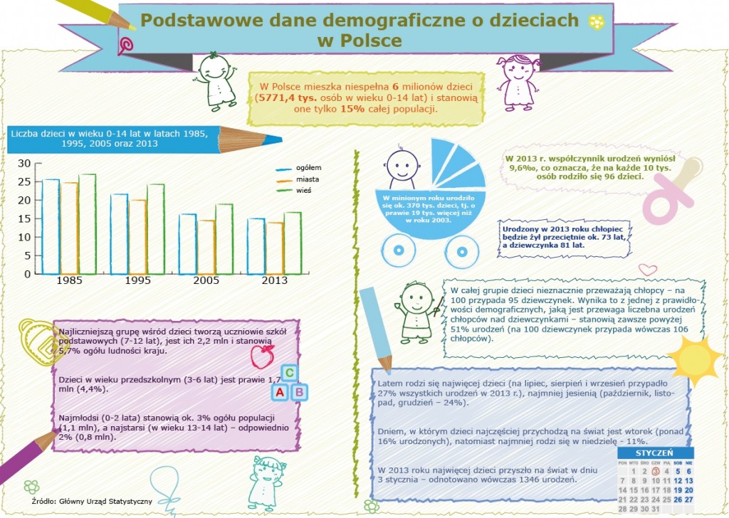 Gdy rozpoczynasz własny biznes ważne jest poznanie rynku i przygotowanie strategii marketingowej. Pomagają nam w tym dane statystyczne. Powyżej zamieściłam jedną z infografik ze strony GUS, dotyczącą danych demograficznych o dzieciach.
